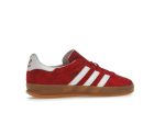 The gum-rubber sole not only provides excellent traction but also enhances the overall aesthetic of these Adidas Gazelle Scarlet Cloud White sneakers. This durable and stylish sole completes the look, adding to the shoe’s vintage charm and long-lasting appeal. These sneakers are a perfect blend of comfort and style, suitable for everyday wear and adding a touch of retro cool to any outfit.