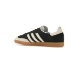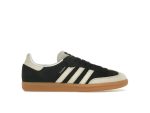 The refined upper is crafted from nearly smooth black suede, complemented by creamy white suede overlays on the toe and iconic three stripes. Matching creamy white leather adorns the heel and tongue, featuring embossed horizontal stripes for a touch of elegant detail. The subtle black Adidas trefoil branding on the tongue and Samba branding along the stripes complete the sophisticated look.