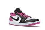 Key features include the black and white colorway accented with Active Fuchsia, a mix of leather and synthetic materials for the upper, the iconic Nike Swoosh and Jordan Wings branding, and a perforated toe box for enhanced breathability. The Jordan 1 Low Black Active Fuchsia is a perfect example of classic design updated with modern flair.