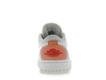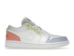 This Jordan 1 Low boasts a striking multicolor leather upper. The colorway, a blend of Sail, White, Zitron, and Summit White, creates a vibrant yet balanced aesthetic. Noticeable details include a white toe box, a light blue forefoot panel, a muted yellow eyelet panel, and a cream quarter panel accented by a classic white Swoosh.
