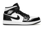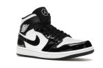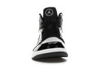 White leather underlays provide a crisp contrast to the black patent leather, enhancing the shoe’s visual appeal. The classic Wings logo, also in white, is prominently displayed on the ankle, further solidifying its Jordan heritage. A Jumpman tongue tag on a nylon tongue completes the design, adding an extra layer of authenticity.