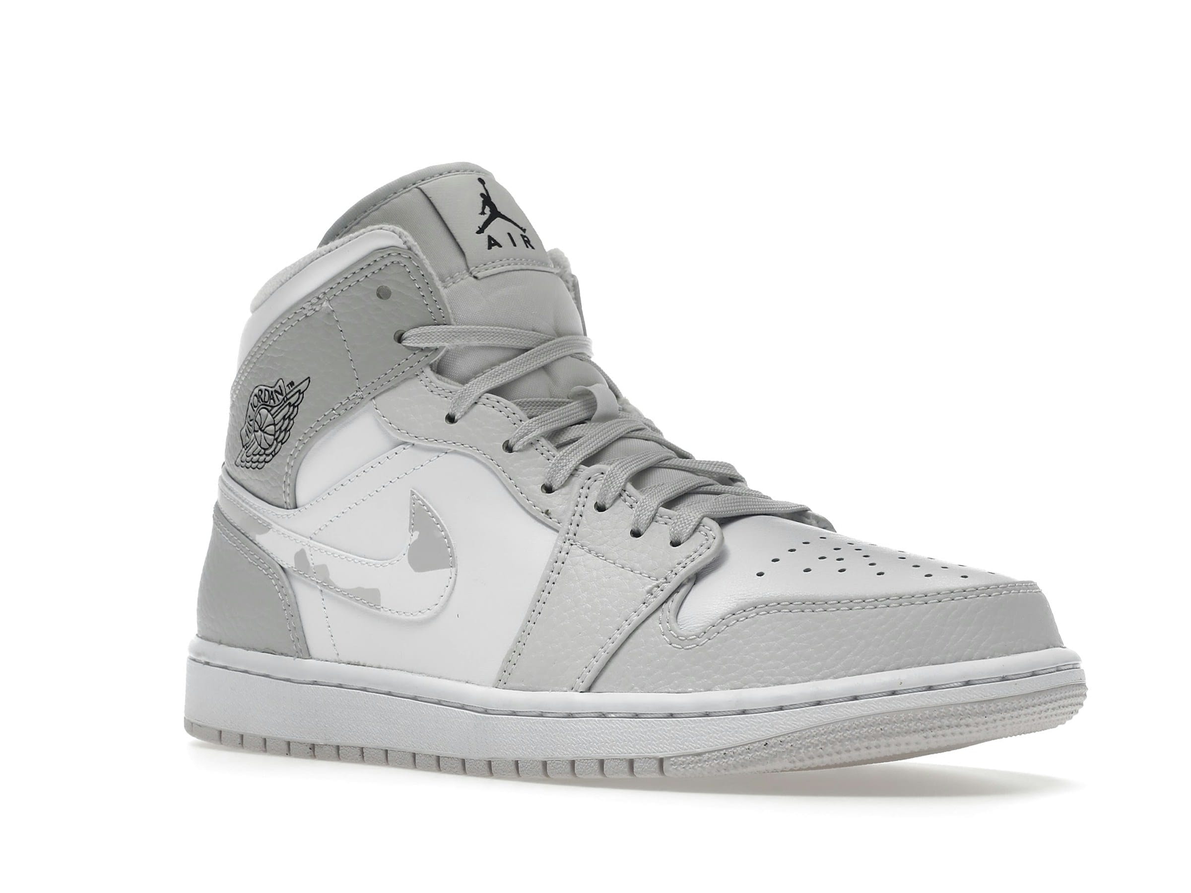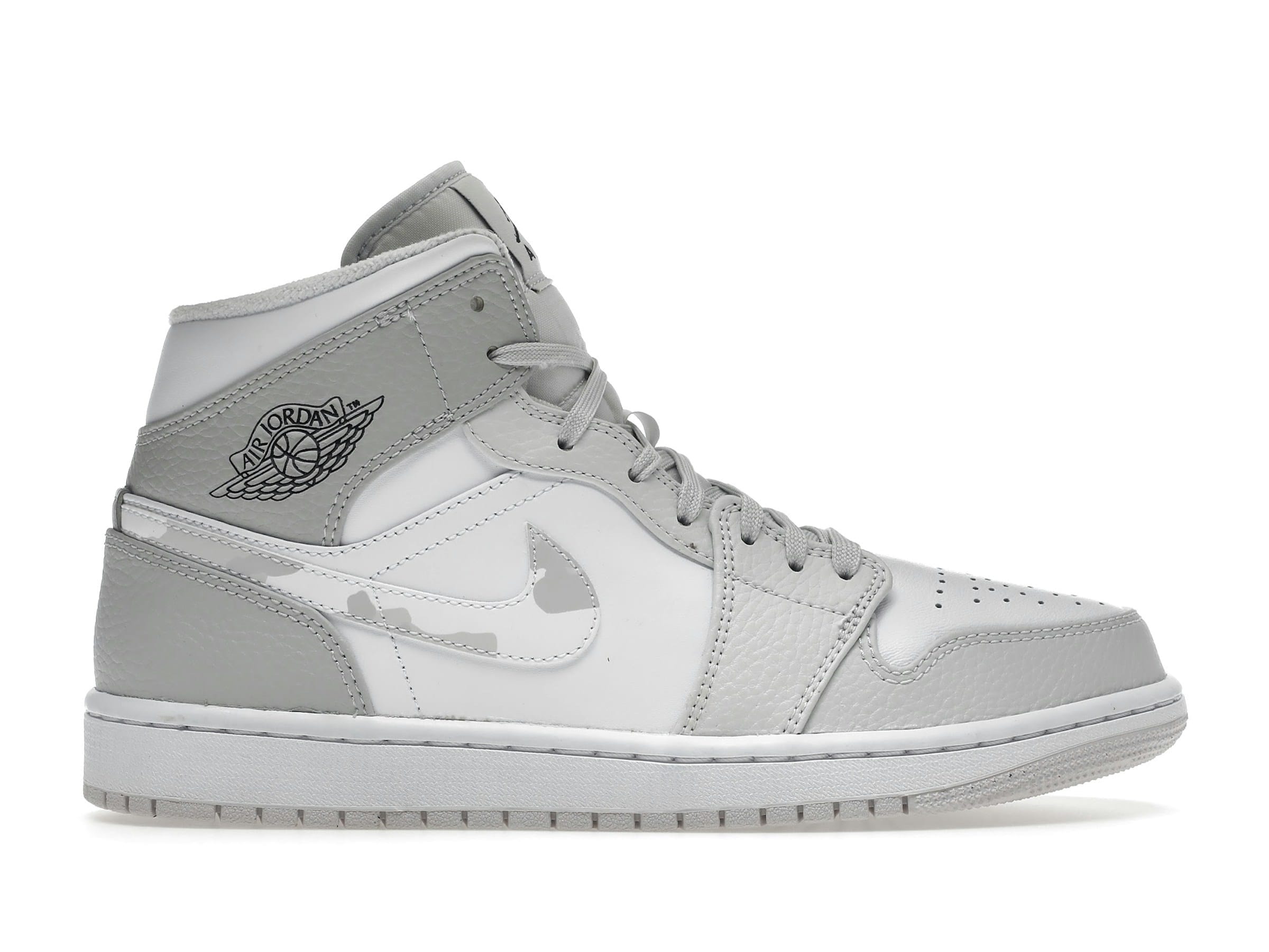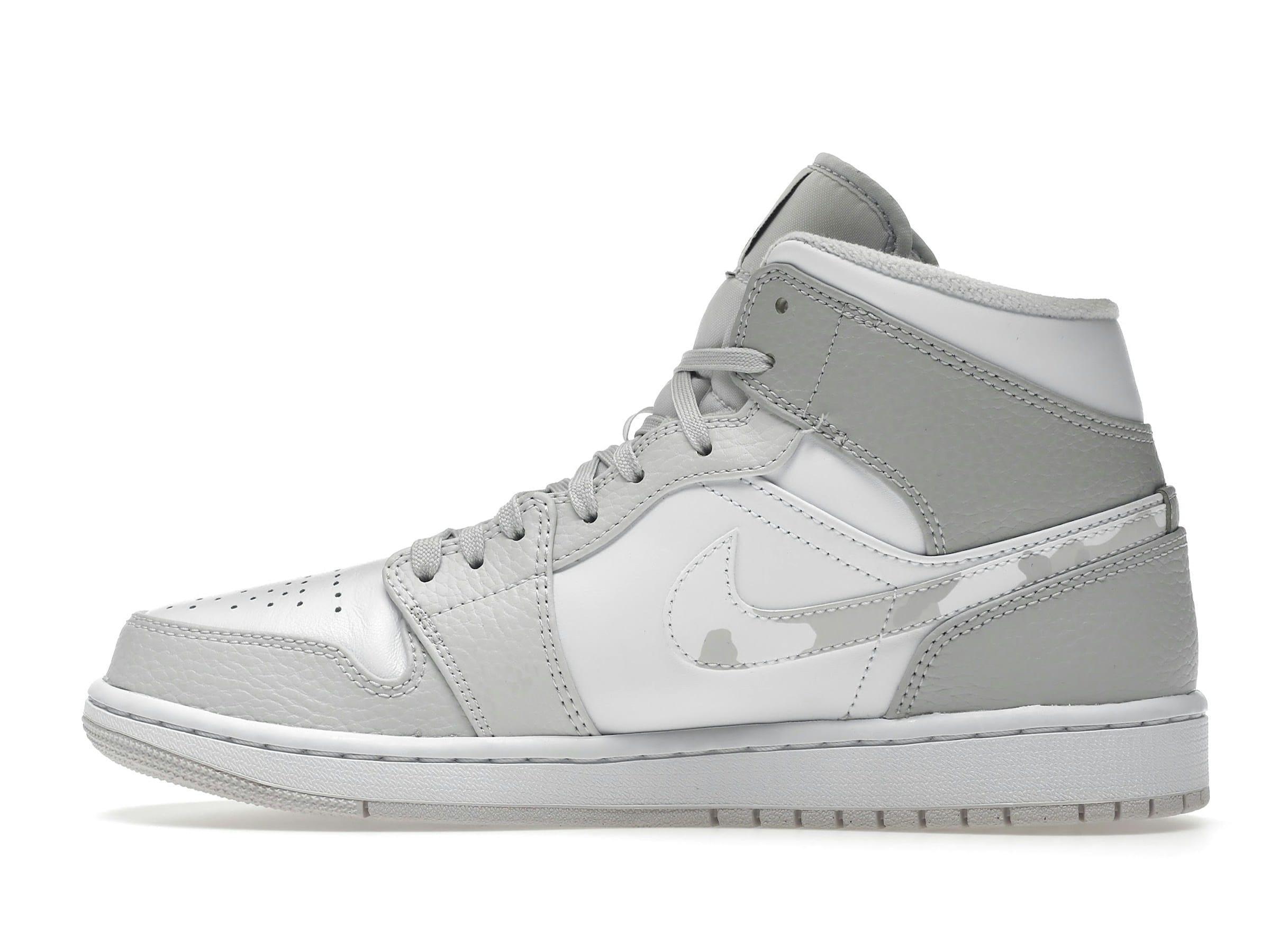 The Jordan 1 Mid Grey Camo (DC9035-100) is a stylish blend of classic design and modern camouflage. Released on December 21, 2020, this mid-top sneaker features a predominantly white leather upper, accented by subtle grey camouflage detailing.