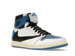 The Jordan 1 Retro High OG SP Fragment x Travis Scott is a highly sought-after collaboration that seamlessly blends iconic design elements with modern flair. This limited-edition sneaker boasts a premium tumbled leather upper in a striking Sail/Black-Military Blue-Shy Pink colorway, reminiscent of a 1985 Jordan 1 Royal press sample.