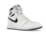 Adding to its refined aesthetic, a substantial metallic navy swoosh logo sweeps across the side, creating a striking contrast against the clean white base. The iconic Wings logo is subtly imprinted on the collar, a signature detail that solidifies its authenticity. The metallic navy outsole completes the look, providing durable traction.