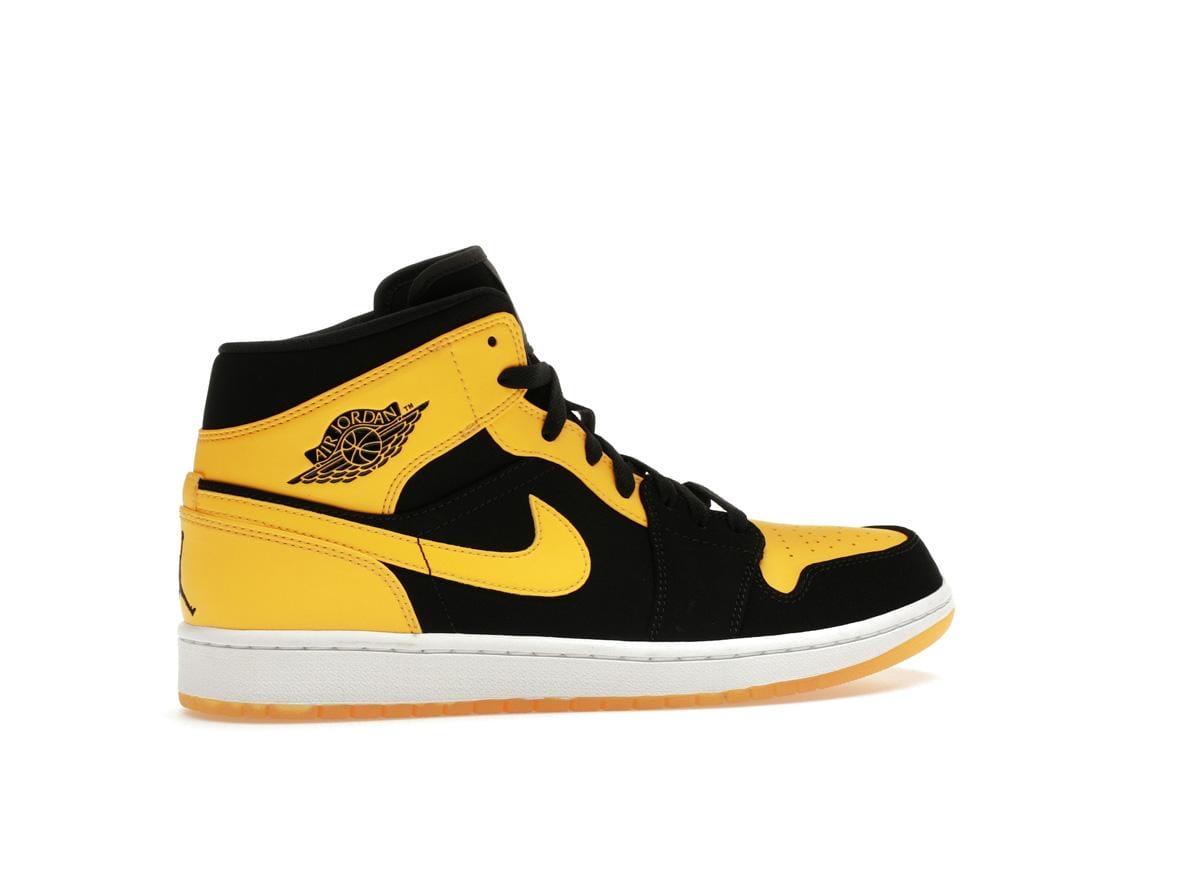 Crafted with a premium mix of leather and suede, the Jordan 1 Retro Mid New Love boasts a striking Black, White, and Varsity Maize color scheme. The vibrant yellow overlays add a pop of color against the classic black base, while the white accents provide a clean contrast. Noticeable details include the debossed “Jordan” Wings logo on the collar, the Jumpman branding on the heel and tongue, and a perforated toe box for enhanced breathability. The iconic yellow swoosh completes the design.