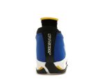 Comfort and responsiveness are key features of this Jordan 14. A full-length Zoom Air unit in the midsole provides exceptional cushioning, ensuring a light and comfortable ride with excellent impact protection. The striking contrast of black and white accents complements the Varsity Royal Blue, while a pop of Varsity Maize (yellow) on the tongue tab and Jumpman logo adds a unique touch.