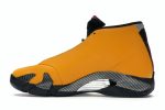 Experience the iconic Jordan 14 Retro in a striking University Gold colorway. This celebrated sneaker design blends athletic performance with a luxurious aesthetic, drawing inspiration from the sleek lines of a sports car.