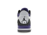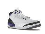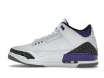 Bold pops of dark iris purple accentuate the heel and ankle, adding a vibrant touch to the otherwise neutral palette. The shoe’s sophisticated look is further enhanced by a black interior and a textured black-and-gray elephant print overlay, a signature element of the Jordan 3. These details are complemented by a crisp white midsole and a durable cement grey outsole, offering a perfect balance of style and functionality.