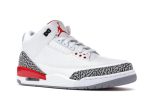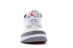 The iconic design features a clean white leather upper, accented by the instantly recognizable cement grey detailing that defines the Jordan 3 silhouette. Bold fire red accents add a pop of color, complementing the classic look. The Jumpman logo proudly sits on the tongue and heel, completing the authentic Jordan branding.