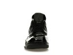 The striking all-black patent leather upper delivers a sleek, luxurious look. This is complemented by a matching black outsole, providing excellent traction and grip. A subtle touch of white on the midsole near the heel’s Air unit offers a clean contrast, enhancing the shoe’s overall visual appeal. The black wax laces add a touch of texture and refinement.