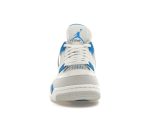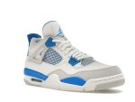 Crafted from premium leather, the Jordan 4 Retro Military Blue boasts a striking color combination of white, military blue, and neutral grey. The iconic Jumpman logo proudly sits on the tongue and heel, while perforation vents on the upper ensure breathability. Notice the detailed triple stitching and the eye-catching blue accents on the seams.