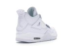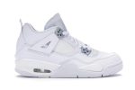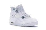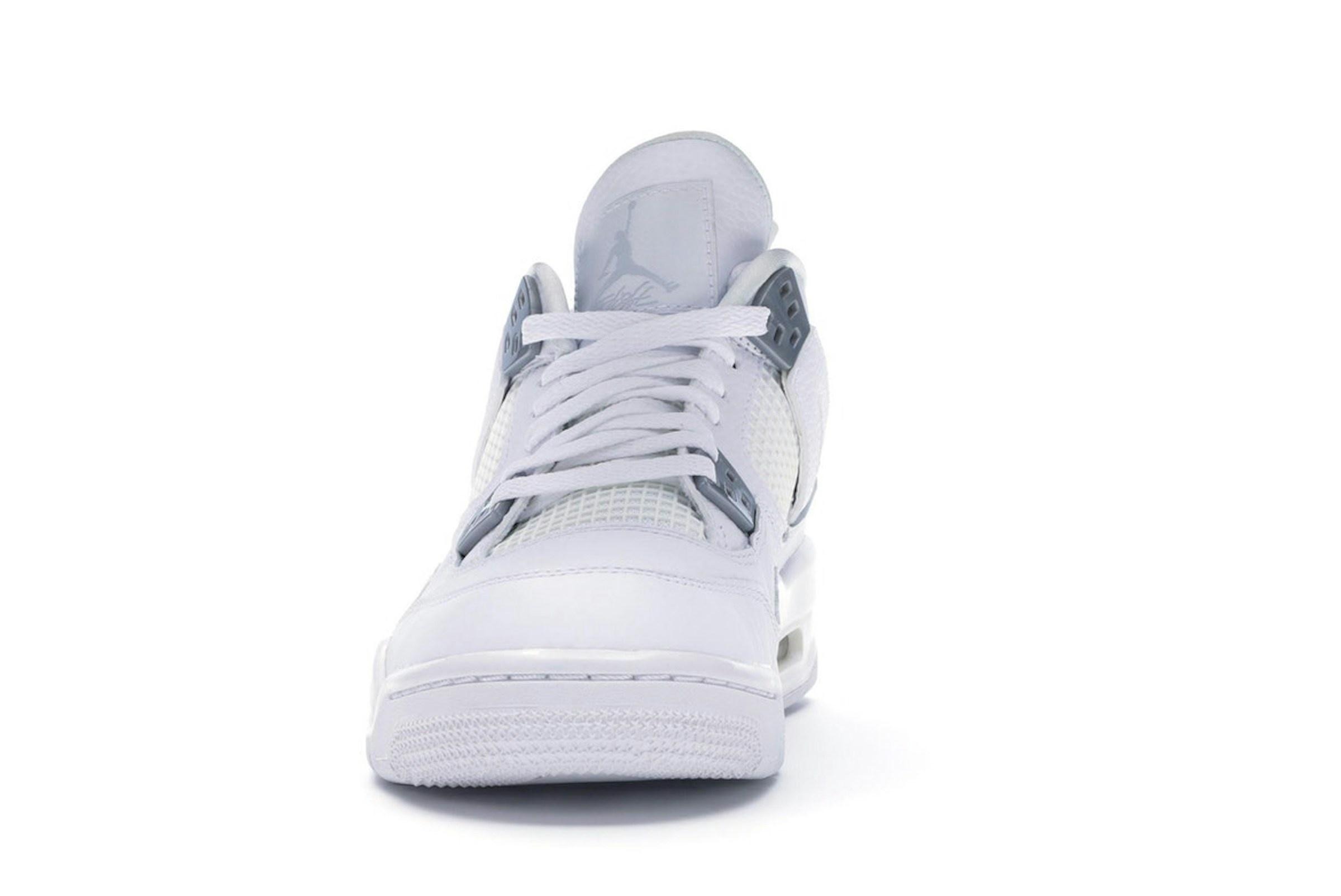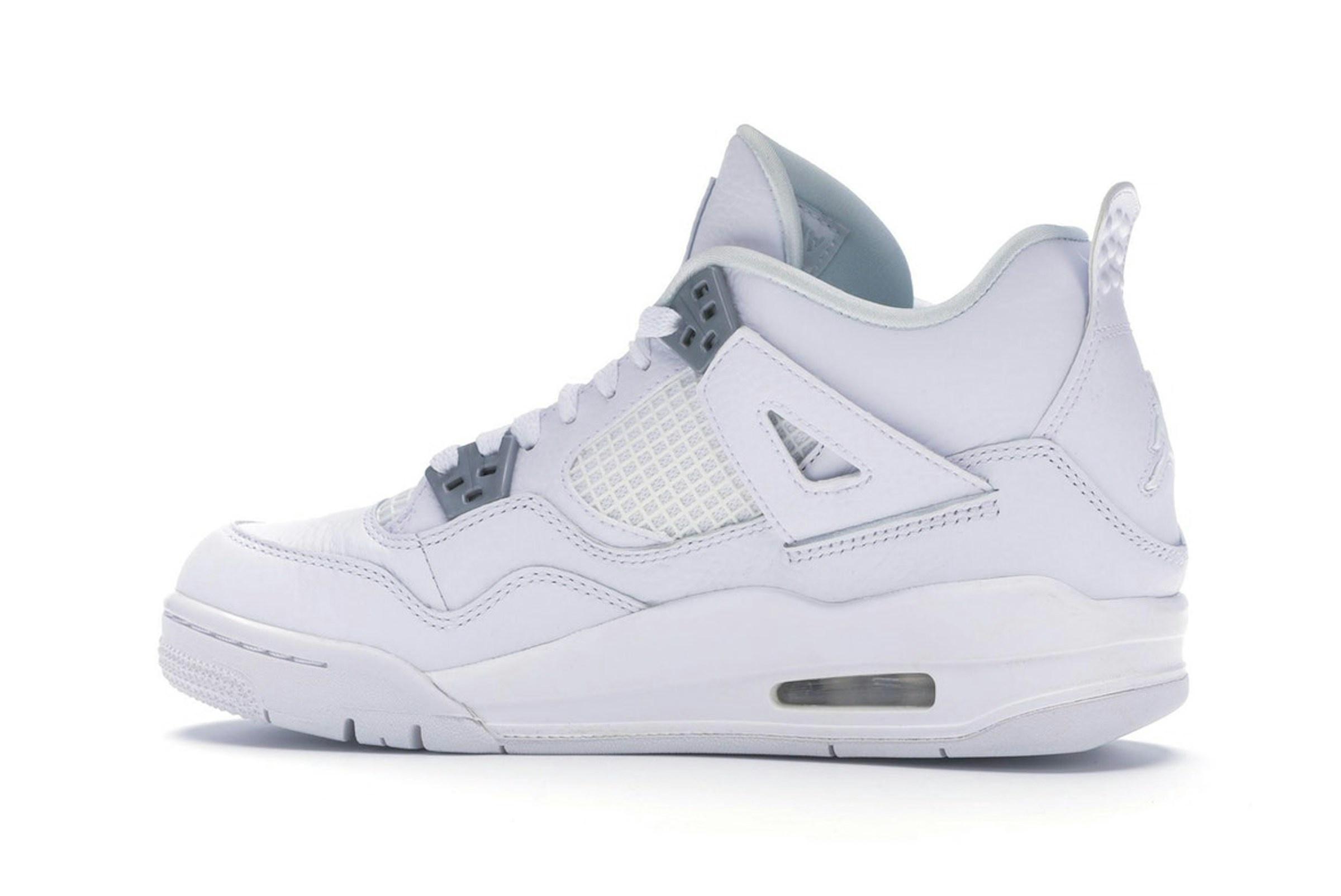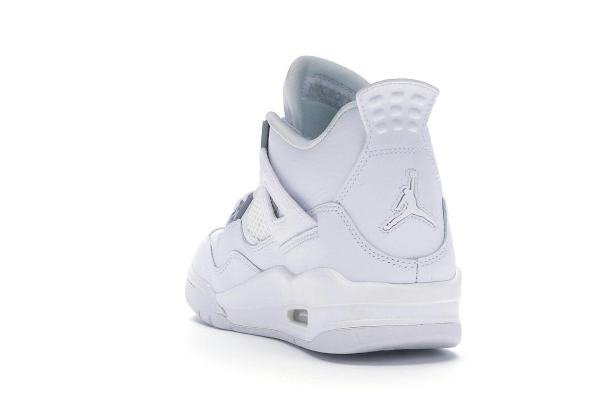 Air Jordan 4 Retro Pure Money (2017) GS (408452-100). Classic white leather trainers with metallic silver accents. Premium comfort & iconic Air Jordan style. Grade school sizing.