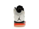 The shoe’s color blocking masterfully combines white, orange, and black, creating a vibrant and eye-catching aesthetic. A unique twist on the traditional Jordan 5 design is the use of translucent mesh on the quarter panel and tongue, offering a fresh perspective on a timeless silhouette. This detail adds depth and texture, further enhancing the shoe’s captivating look.