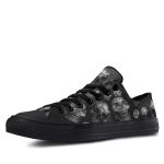 Step into the mysterious allure of the Deathly Skull Pattern Black Lowtop Sneakers, where edgy design meets everyday comfort. These unique sneakers are crafted to make a bold statement with their striking skull pattern, set against a sleek black canvas backdrop. Ideal for those who dare to stand out, these shoes blend gothic charm with modern streetwear style.