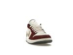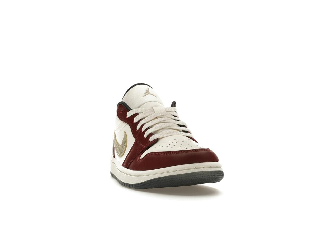 Crafted with a luxurious combination of materials, these Jordan 1 Low’s boast a crisp white leather base, accented by rich, dark red tumbled leather overlays. The contrast creates a visually striking effect, further enhanced by the elegant gold detailing. The white laces and tonal stitching on the foam midsole add a clean, sophisticated touch.
