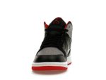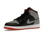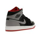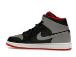 The iconic Nike Swoosh, rendered in a matching grey, seamlessly integrates with the design, while the Jordan logo is subtly stamped in black on the lateral ankle strap. Bold pops of red provide striking accents on the outsole, tongue, and sock liner, adding a vibrant contrast to the primarily black and grey palette. This attention to detail elevates the Jordan 1 Mid Bred Shadow, making it a versatile choice for everyday wear or to elevate your sneaker game.