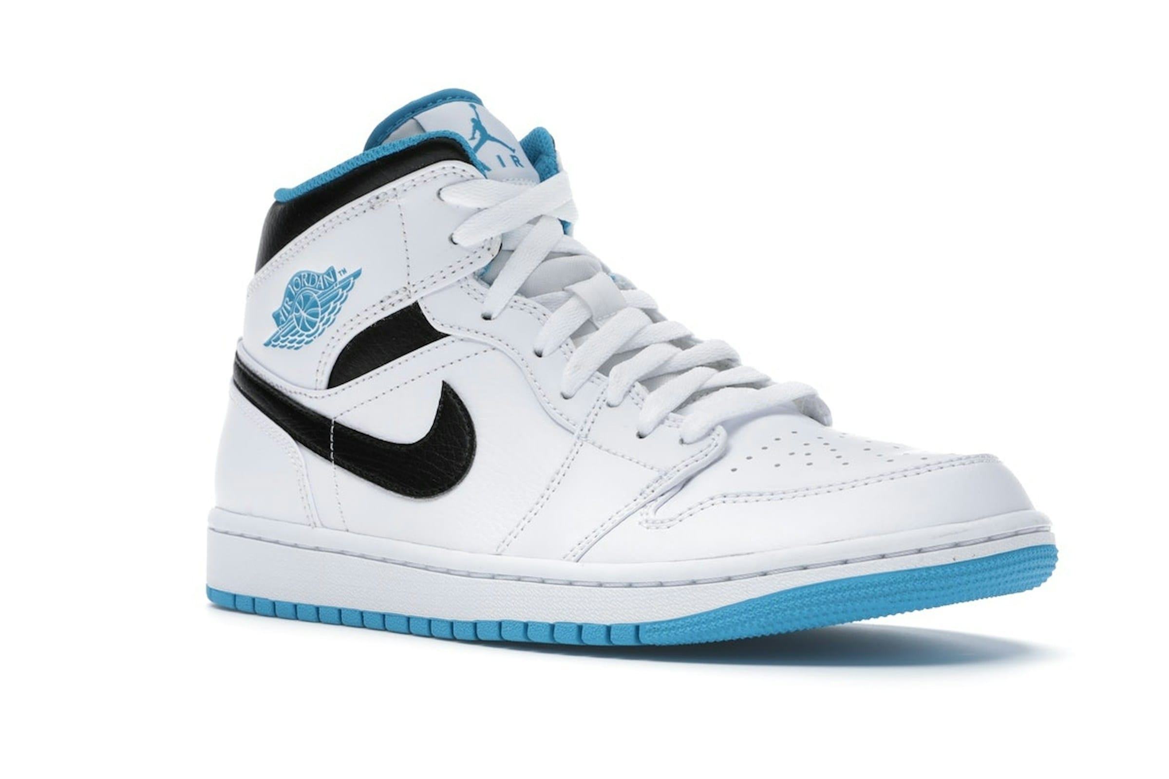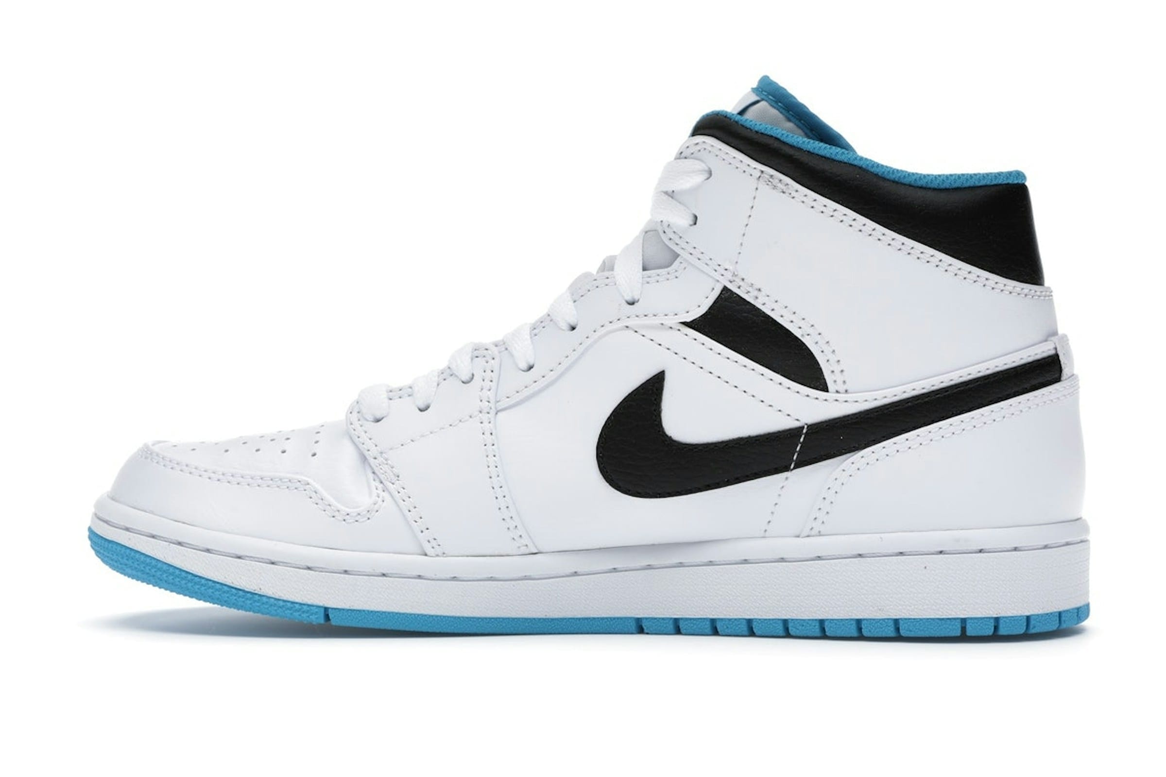 Released in September 2020, these Jordan 1 Mid Laser Blues offer a comfortable and fashionable option for everyday wear. The combination of white leather, black accents, and the signature Laser Blue details makes them a versatile sneaker suitable for various outfits and occasions. This mid-top silhouette provides excellent ankle support while maintaining a sleek profile.