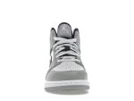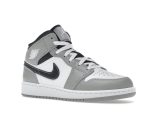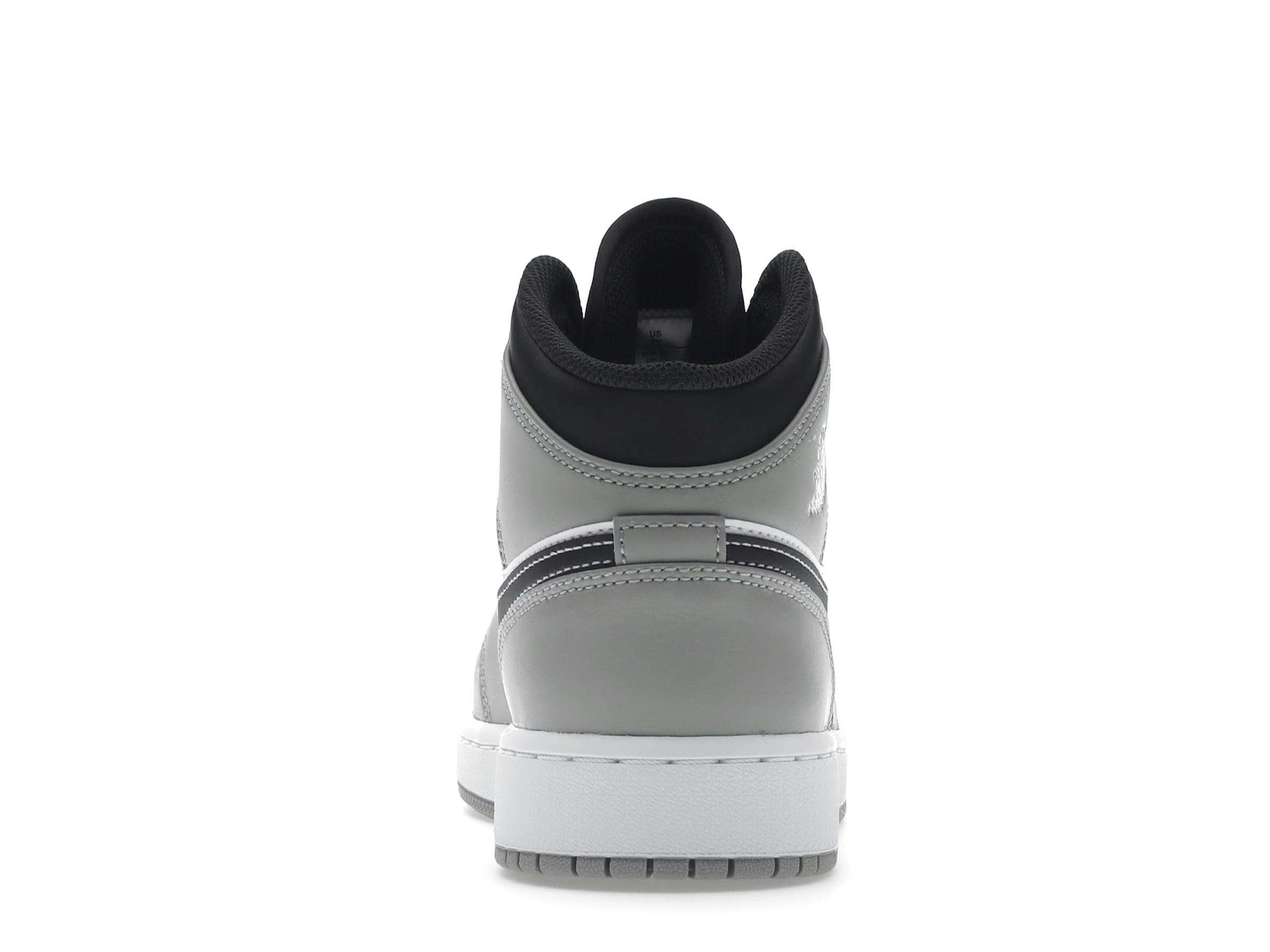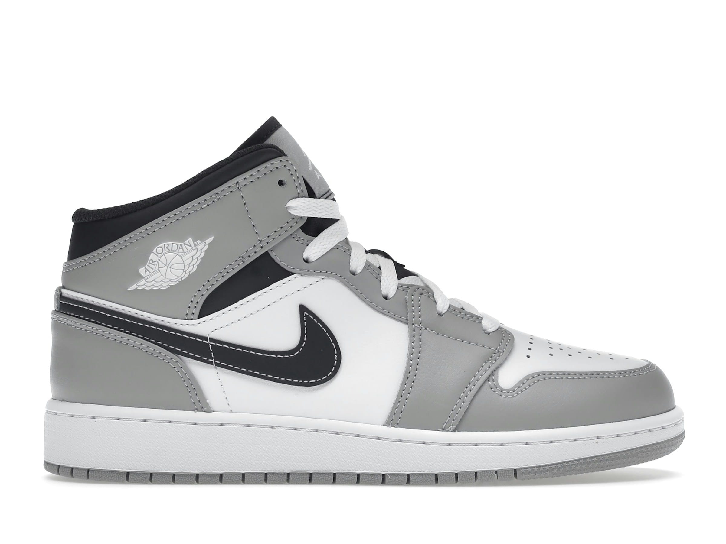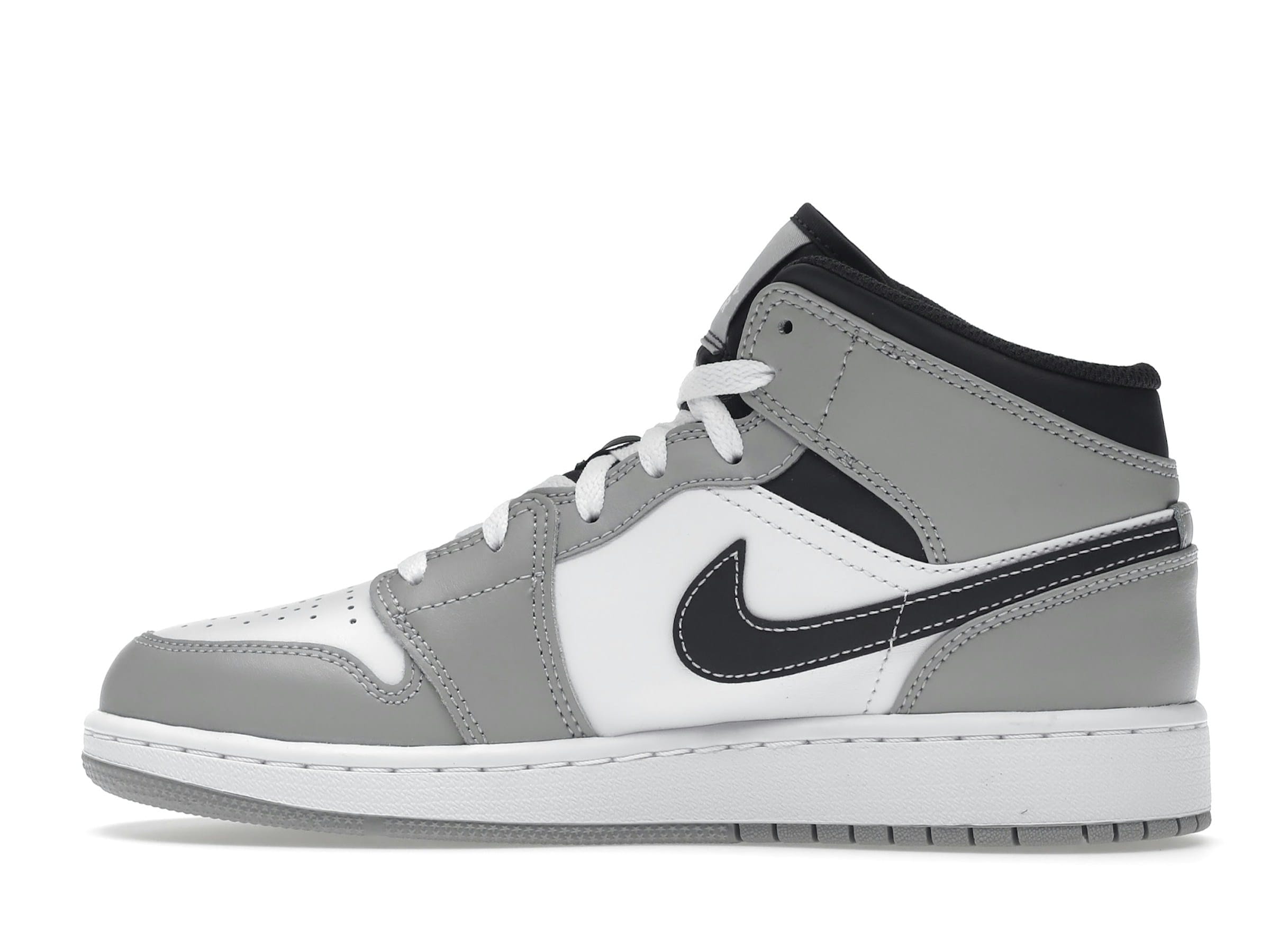 These Jordan 1 Mid Light Smoke Grey (GS) sneakers offer a stylish and comfortable option for young sneakerheads. Designed for grade school sizes, these kicks boast a captivating color scheme blending grey, black, anthracite, and white.