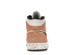 The upper boasts a clean white base, contrasted by Cider-colored overlays for a sophisticated look. Adding a playful touch, multicolor paint splatters are artistically incorporated into the design, creating a dynamic and eye-catching effect. The mismatched Swoosh logos further enhance the unique character of the shoe, with one side showcasing a classic suede design and the other featuring a painted-on swoosh.