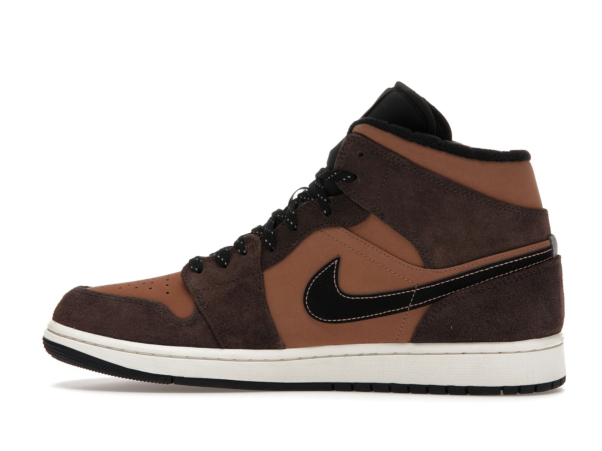 The classic Jordan 1 Mid profile is elevated with subtle yet striking details. Black Swooshes provide a sharp contrast against the warm tones of the upper, while hiking-inspired laces add a unique outdoor element. A reflective patch on the heel adds a modern touch, ensuring visibility and style in low-light conditions. This thoughtful combination of materials and design cues creates a sneaker thats both sophisticated and versatile.