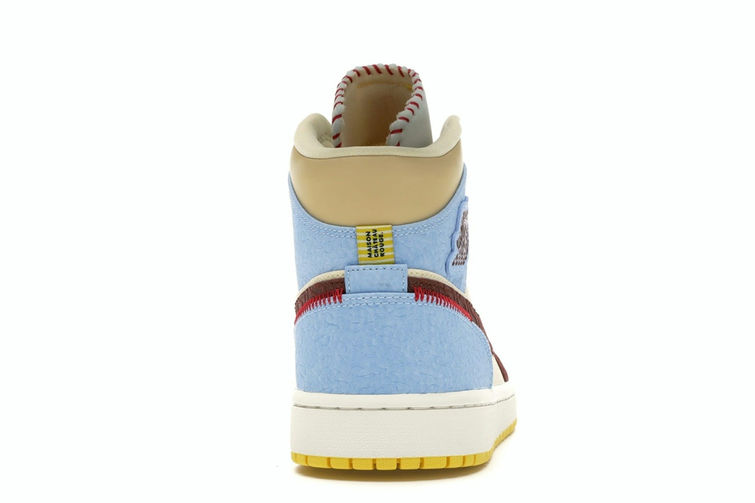 The shoe boasts a rich tapestry of colors and textures. The upper is crafted from a combination of cream, brown, yellow, and light blue leather, creating a visually captivating blend. Red stitching accents the heels and tongues, adding a pop of vibrant color. Maison Chateau Rouge branding is prominently displayed on the heel tabs, further emphasizing the collaborative nature of this release. The design is completed with sail midsoles and yellow outsoles, providing a clean and sophisticated contrast to the upper’s lively palette.