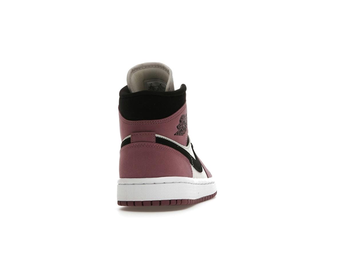 Featuring a high-top design, these Jordan 1 Mids boast a premium leather construction. The rich Light Mulberry leather overlays contrast beautifully against the crisp white base, creating a visually appealing shoe. Accenting the design are black Nike Swooshes and Jordan branding details, adding subtle yet recognizable touches.
