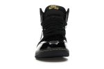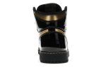 Crafted with premium black and metallic gold patent leather, this shoe boasts a luxurious finish. The eye-catching metallic gold accents are featured prominently on the collar, tongue tag, Nike Swoosh, and Wings logo, adding a touch of regal elegance. These details create a striking contrast against the sleek black base.