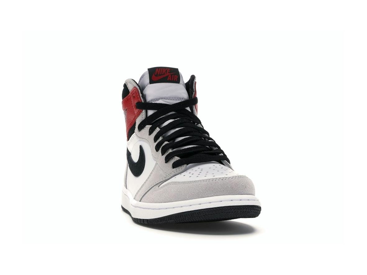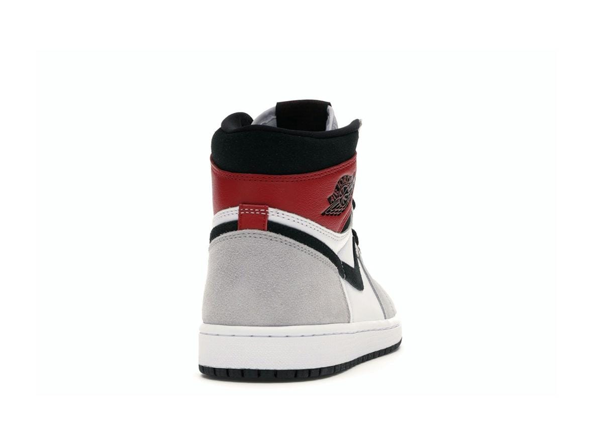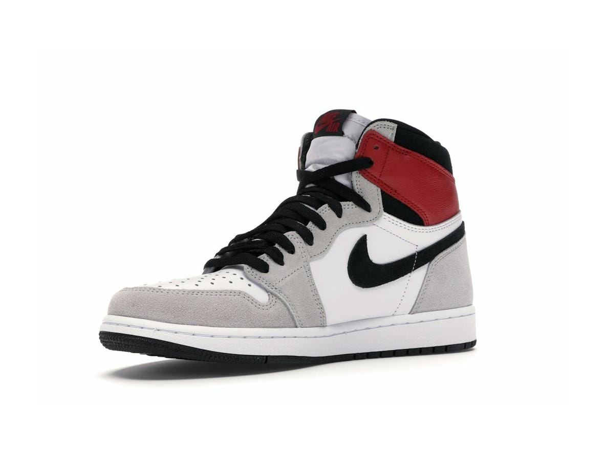 Experience the iconic style and comfort of the Jordan 1 Retro High Light Smoke Grey. This coveted sneaker, released in July 2020, boasts a unique color blocking design that sets it apart from other Jordan 1s. The shoe features a premium white leather upper, contrasted by sophisticated grey suede overlays and a bold varsity red leather ankle panel. These distinct elements work together to create a visually stunning and modern aesthetic.