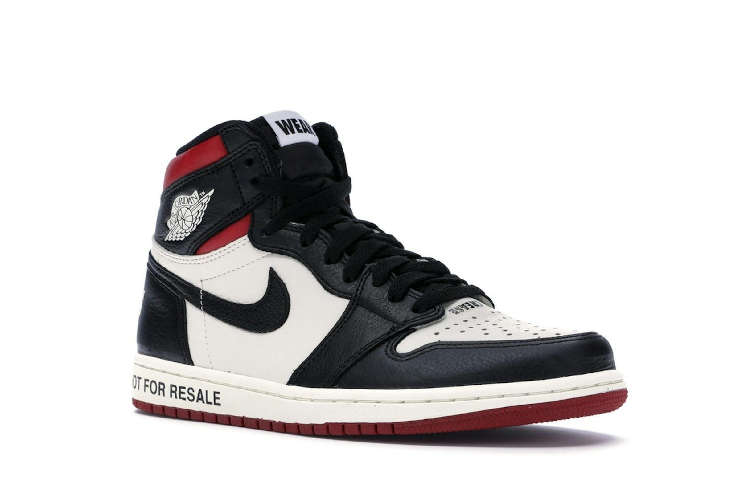 The upper features premium white leather, providing a crisp and fresh look. Black accents, including the signature Nike Swoosh, add a touch of contrast, while the red outsole delivers a vibrant pop of color. The “Not For Resale” text on the midsole adds a unique detail to this already sought-after design.