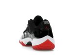 The Jordan 11 Retro Low Bred features a sleek black mesh upper, complemented by the signature patent leather mudguard in glossy black. Varsity Red accents provide a striking contrast, adding a touch of boldness to the overall aesthetic. The clean white midsole offers cushioning and support, while the translucent red outsole completes the signature look.