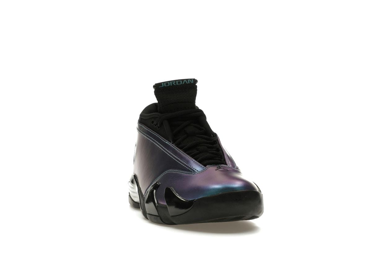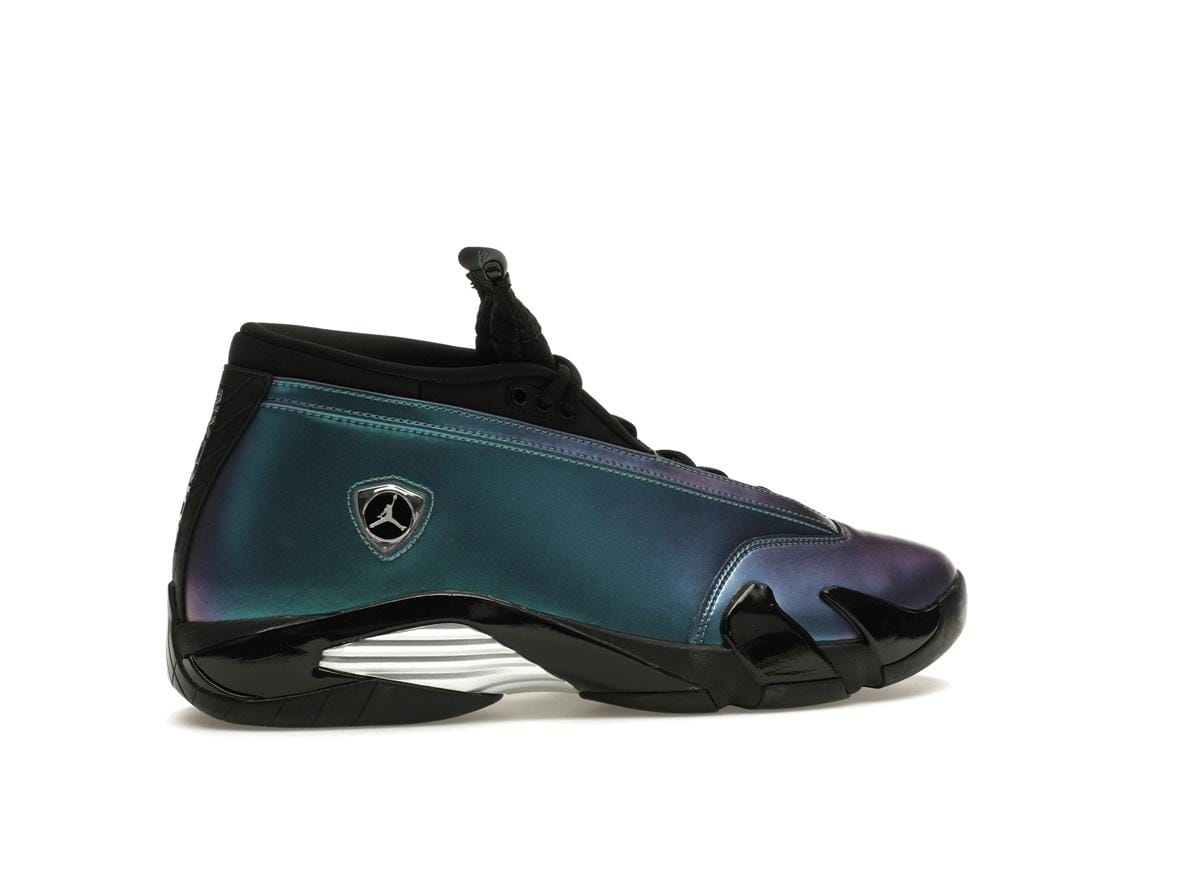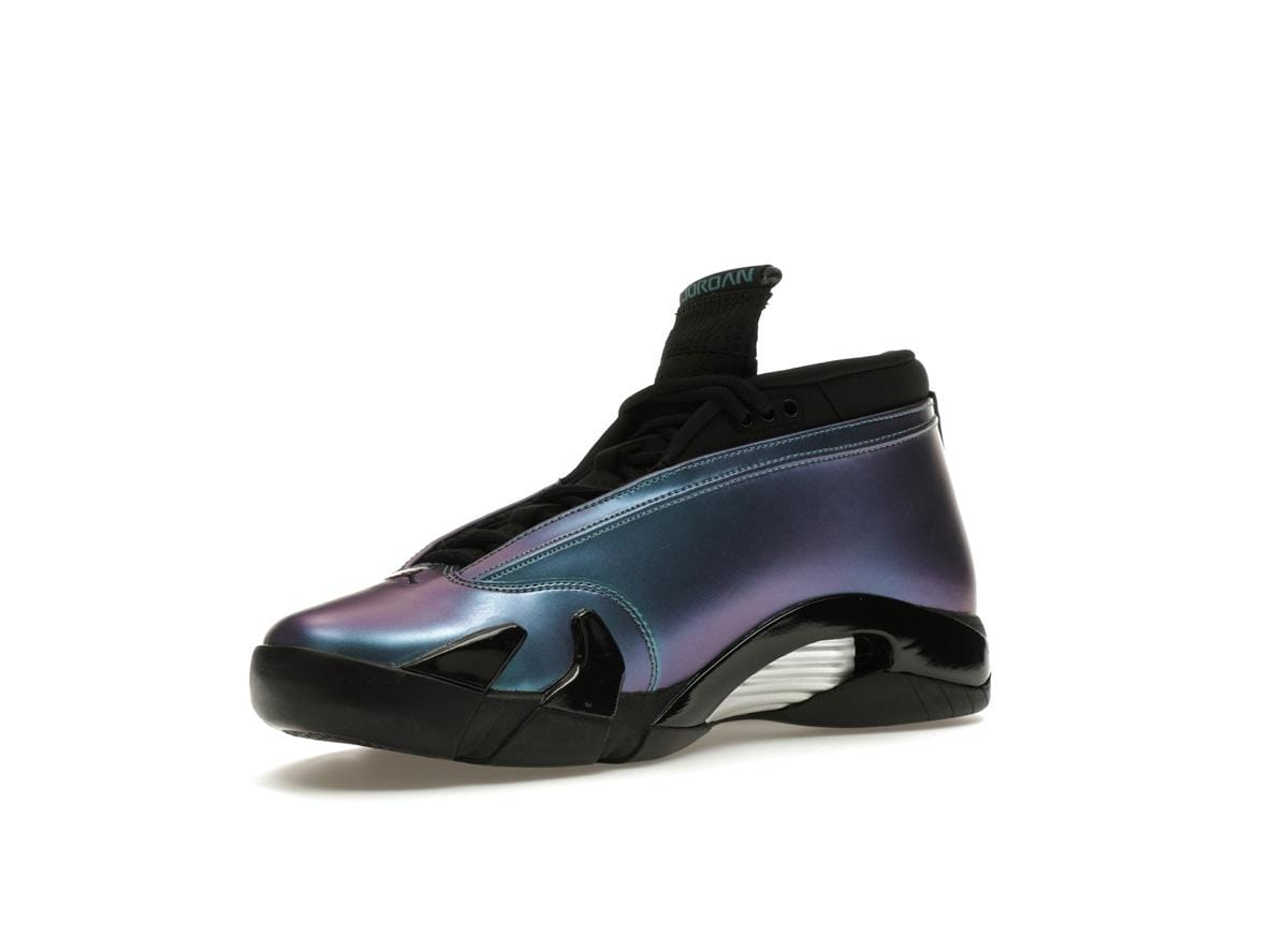 Experience the luxurious comfort and style of the Jordan 14 Retro Love Letter Women’s shoe, a stunning addition to any sneaker collection. This captivating design features a shimmering metallic upper in a sophisticated Mineral Teal and Metallic Silver colorway. The smooth leather construction provides a premium feel, while subtle iridescent highlights create a mesmerizing depth of color as light catches the surface, revealing gradients of dark blue and purple.