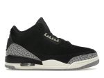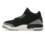 The shoe features a foundation of black nubuck suede, complemented by smooth black leather overlays on the tongue, eye stays, and collar. These leather accents are perforated for enhanced breathability, adding a subtle yet stylish detail. Iconic elephant print leather details on the heel and toe maintain the signature Jordan 3 aesthetic.