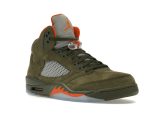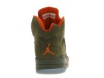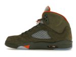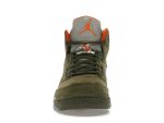 The upper showcases a premium Army Olive suede, complemented by breathable mesh accents peeking through strategically placed cutouts on the side panels. Maintaining the signature Jordan 5 aesthetic, the plastic eyestays and laces are also rendered in Army Olive, providing a cohesive and sophisticated look. Bold pops of Solar Orange on the collar, tongue interior, and midsole add a vibrant contrast to the muted olive tones.