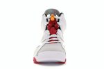 The upper boasts a clean white leather base, accented by subtle grey underlays and pops of bold red detailing. A translucent tongue adds a modern touch, while the patterned outsole provides both style and superior traction. The iconic purple Jumpman logo on the heel completes the design, showcasing the Jumpman’s commitment to quality and heritage.