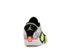 Adding to the vibrant aesthetic, bright yellow midsoles with black outlines provide striking contrast. A pink Jumpman logo on the lateral side completes the design, perfectly balancing the yellow and white elements. These aren’t just stylish; they’re engineered for peak performance with a full-length Air Strobel unit for superior cushioning and responsiveness on the court.