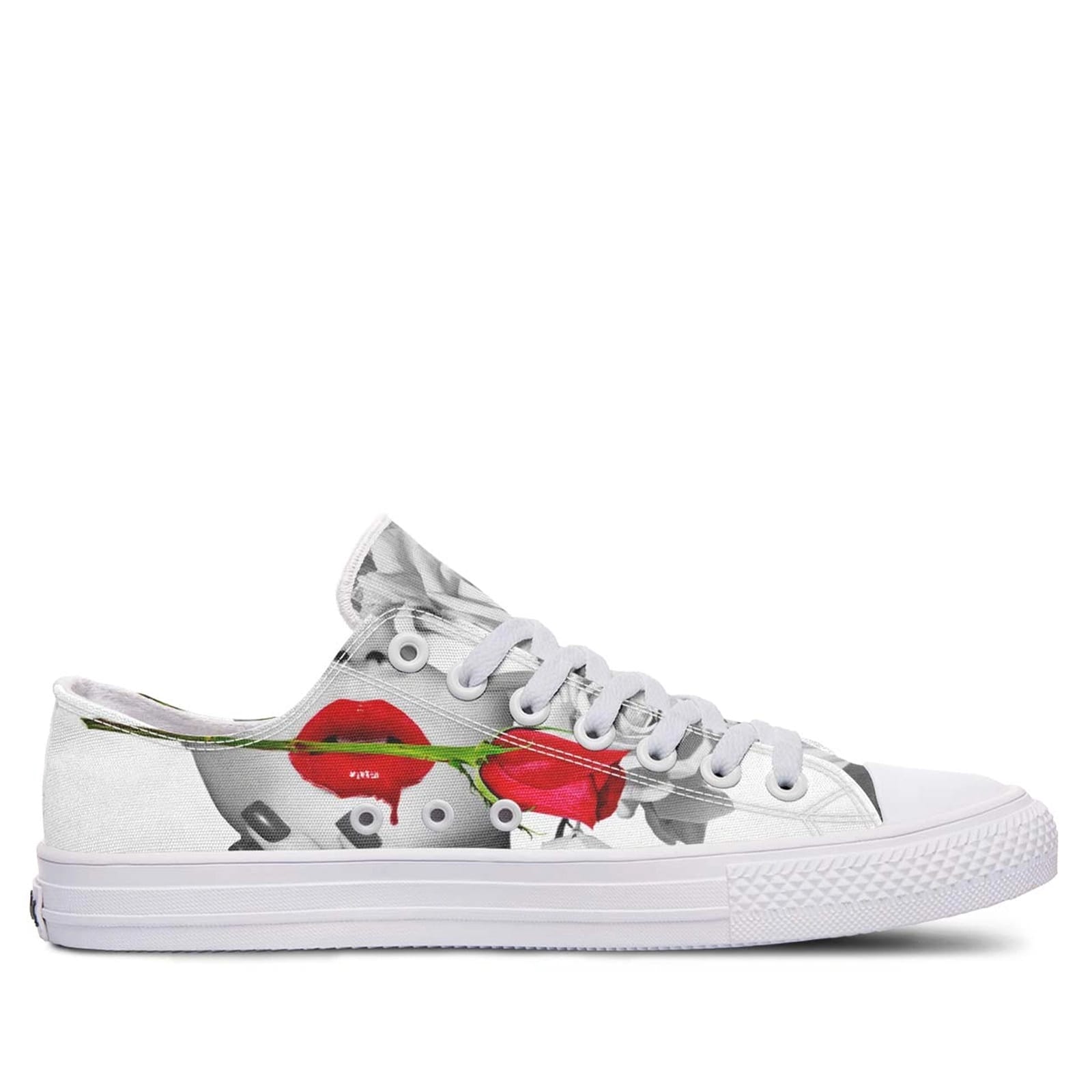 Embrace the delicate charm of our Lips with Flower White Lowtop Sneakers, a beautifully crafted footwear option that combines artistic flair with everyday comfort. These sneakers feature a unique design of elegant lips intertwined with a subtle floral motif, set against a crisp white background, making them a standout addition to any fashion-forward wardrobe.