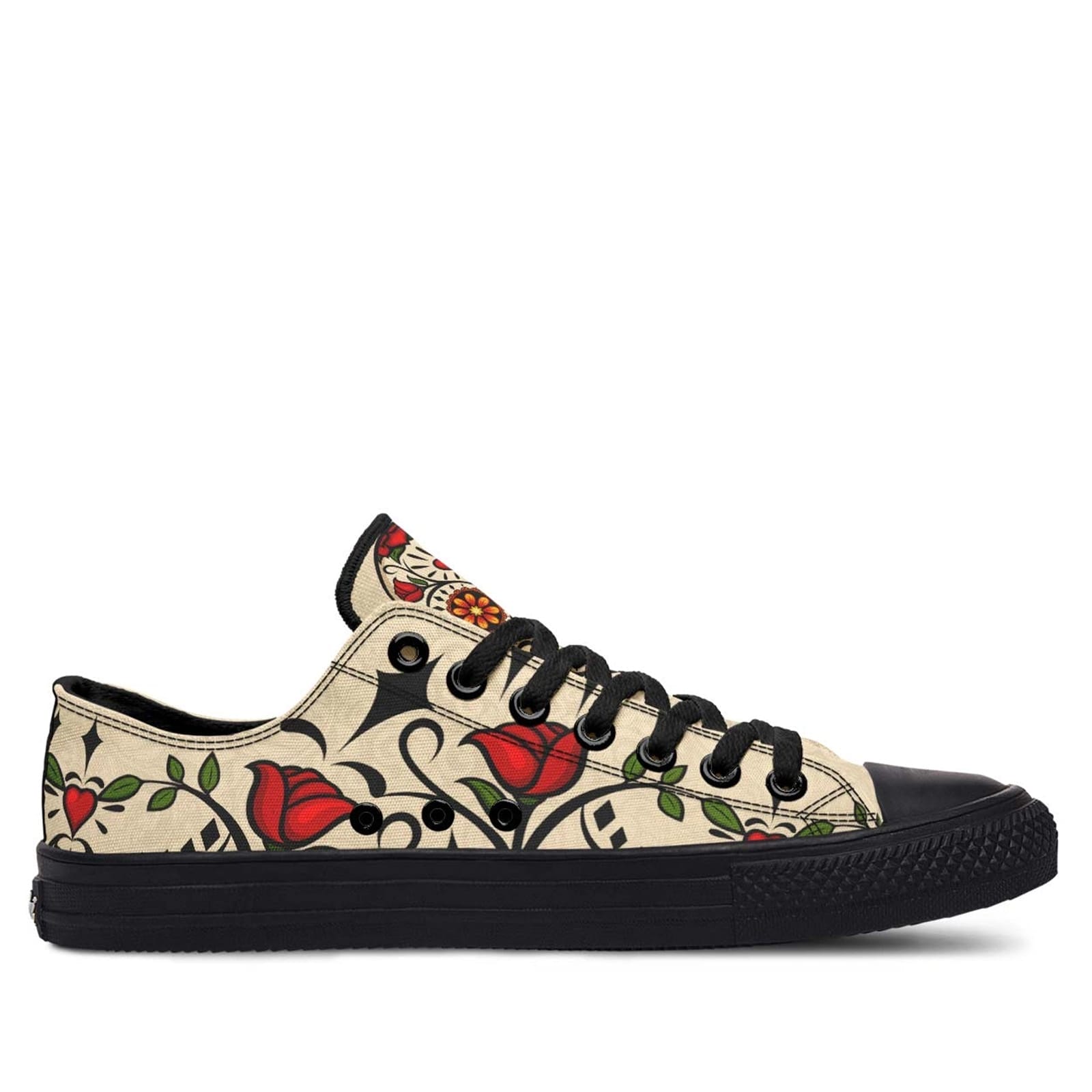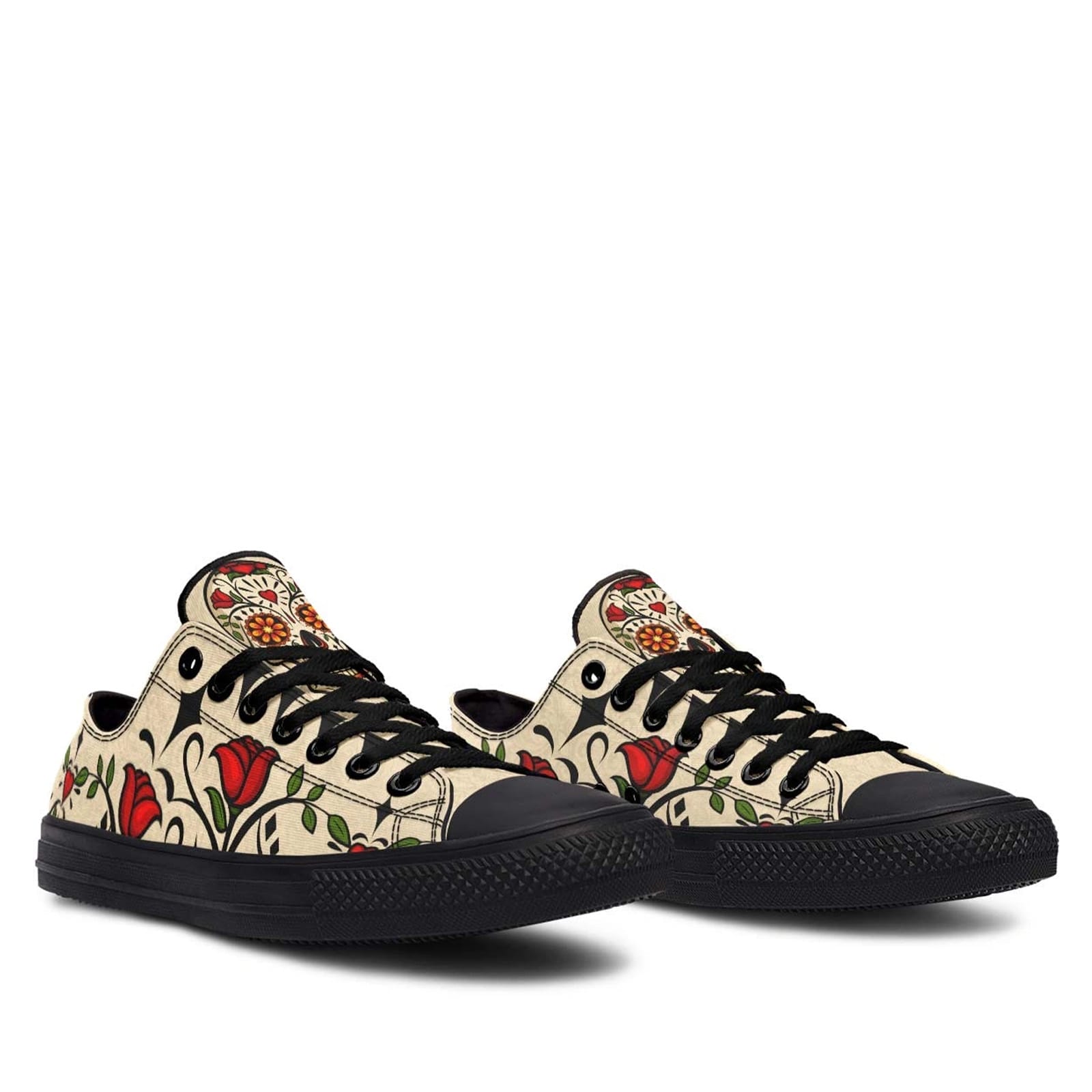 Celebrate the vibrant spirit of Día de los Muertos with our Mexican Skull and Rose Art Lowtop Sneakers. These unique sneakers feature a captivating design that combines a traditional Mexican skull with colorful roses, symbolizing the beautiful connection between life, death, and beauty. The intricate artwork captures the essence of Mexican culture, making these shoes the perfect addition for anyone looking to add a touch of Mexican flair to their wardrobe. Crafted with a comfortable canvas upper and a durable rubber sole, these sneakers ensure both style and comfort for all-day wear.