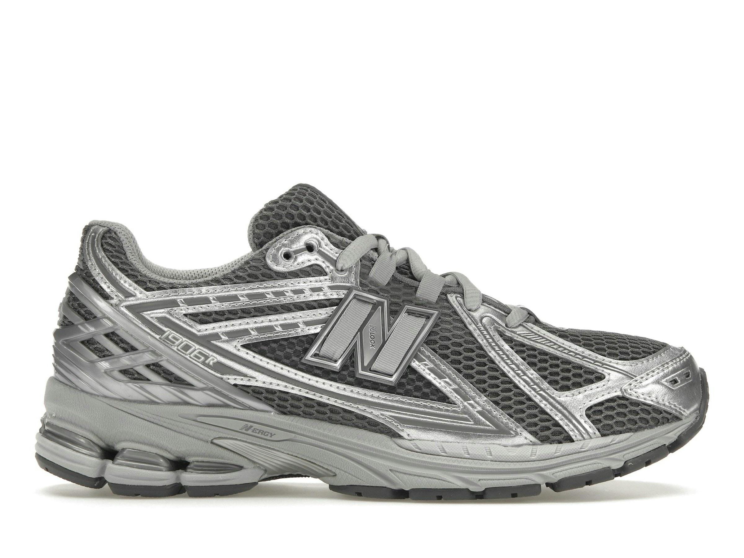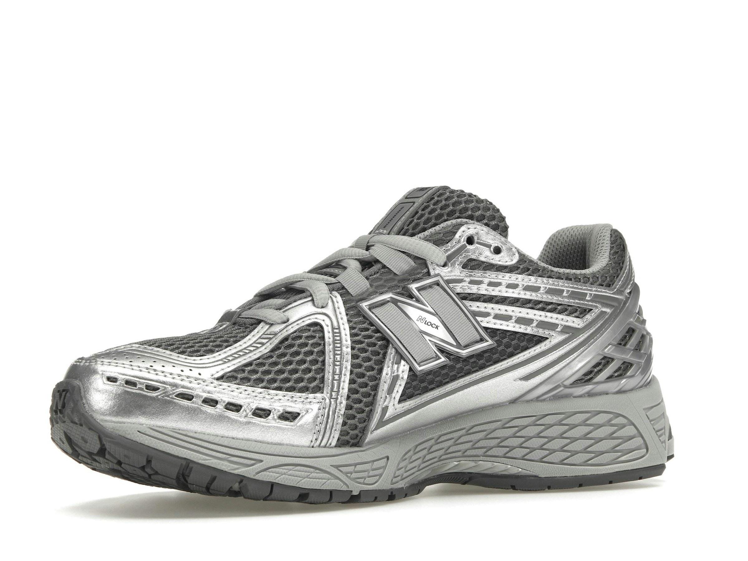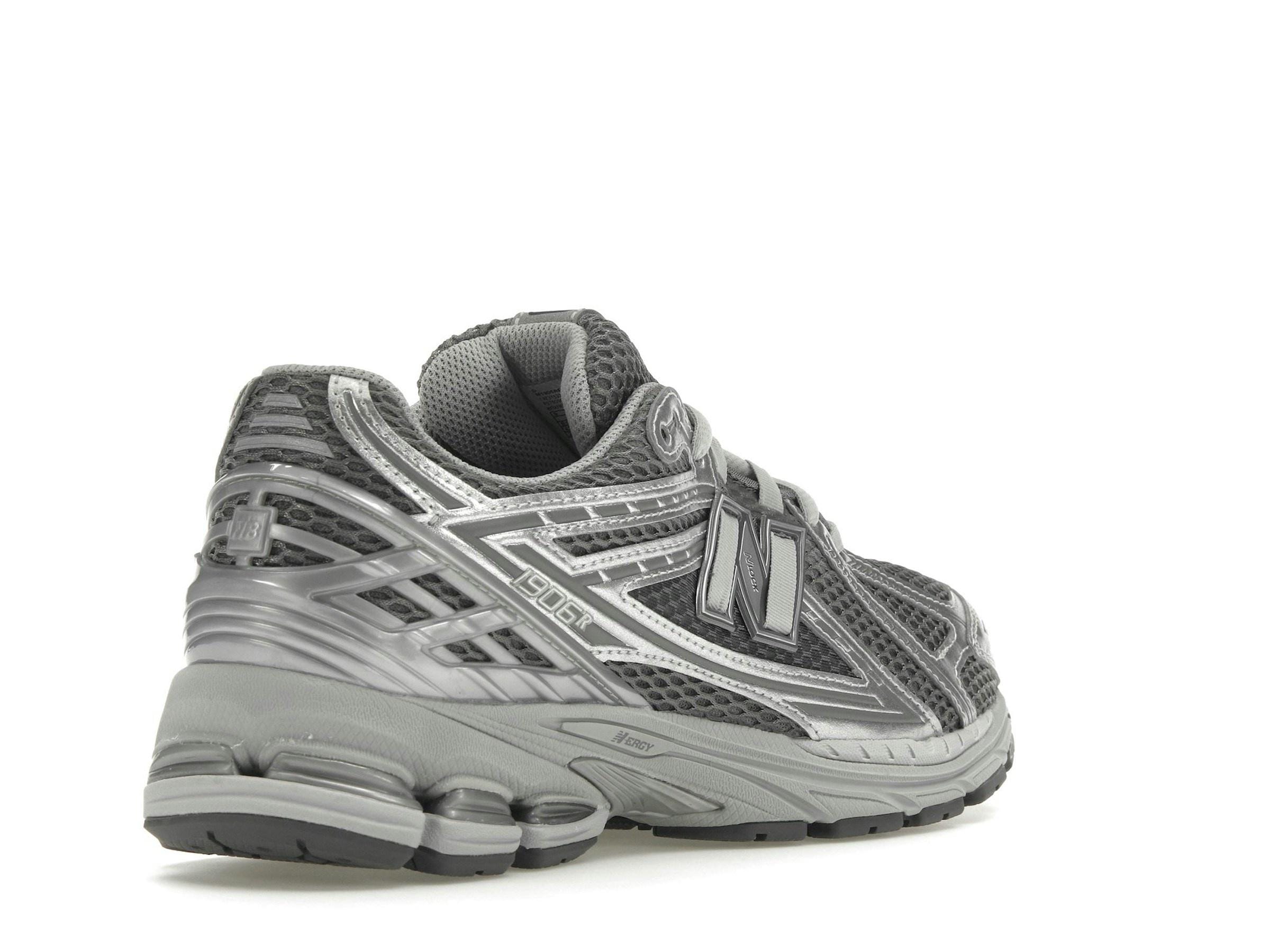 The upper boasts a dark grey mesh construction, enhanced by metallic silver synthetic overlays that wrap around the toe box, midsole, and heel. The signature New Balance “N” logo is prominently featured in a 3D panel design, complemented by N-Lock branding for added support. Further branding details include the “1906R” on the heel overlay and the NB logo on the TPU heel cage. A patterned grey outsole completes the sophisticated look.