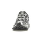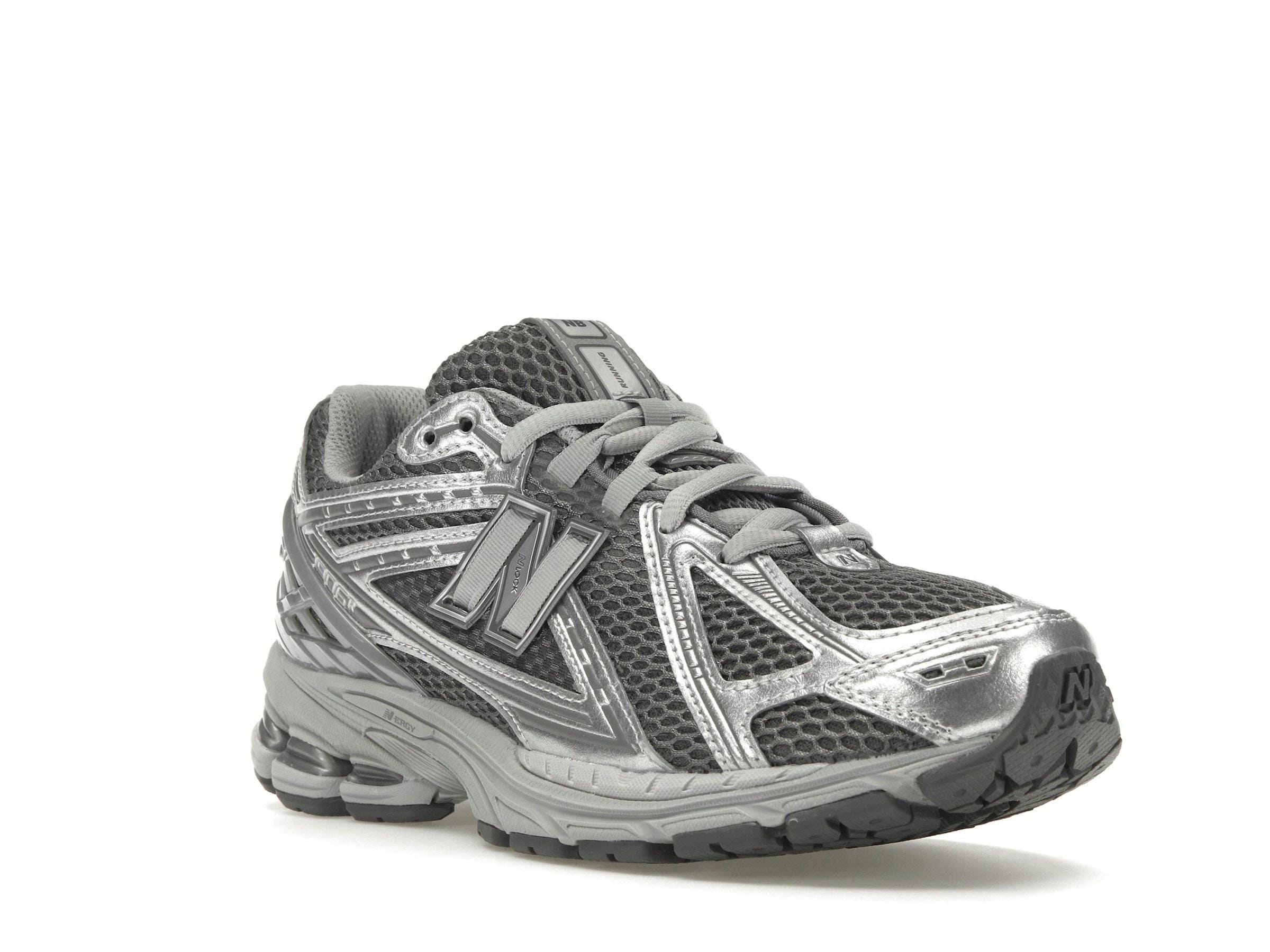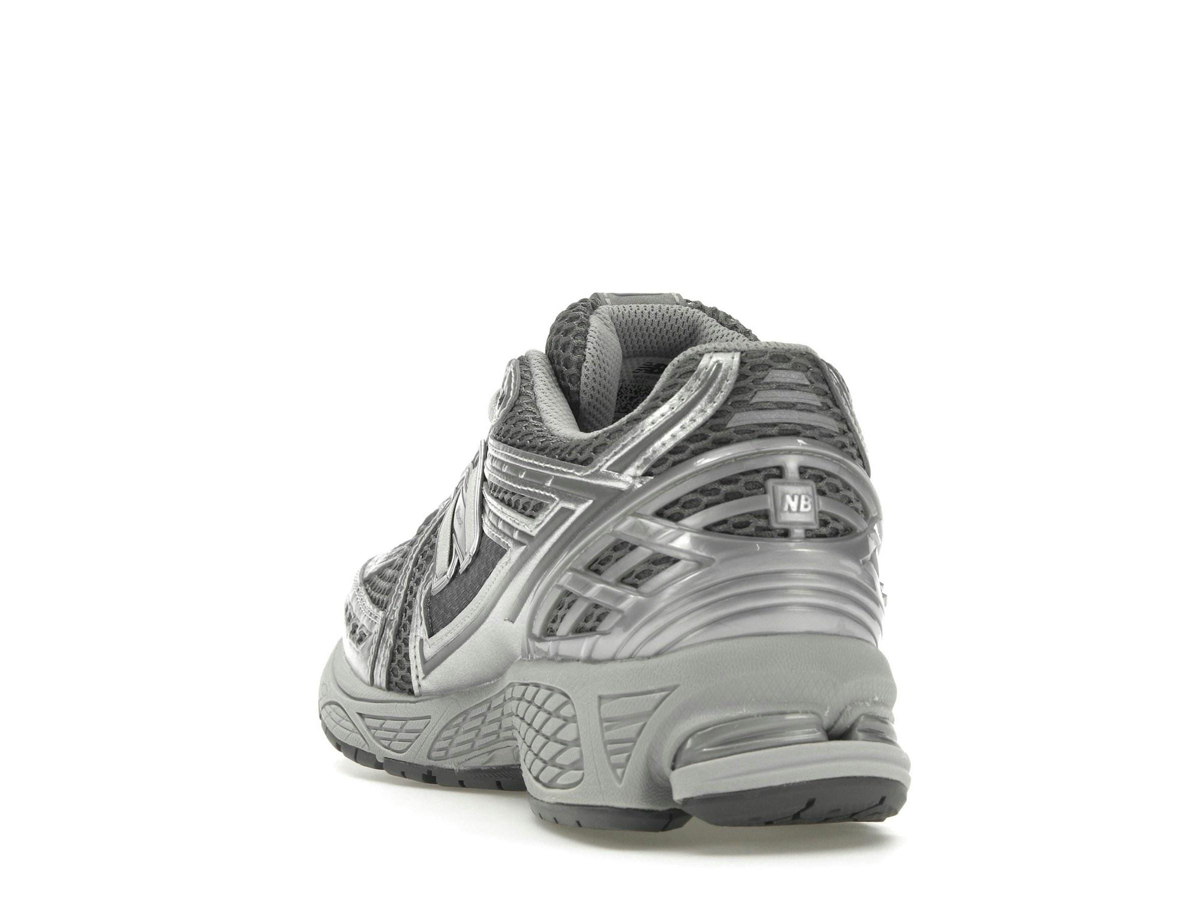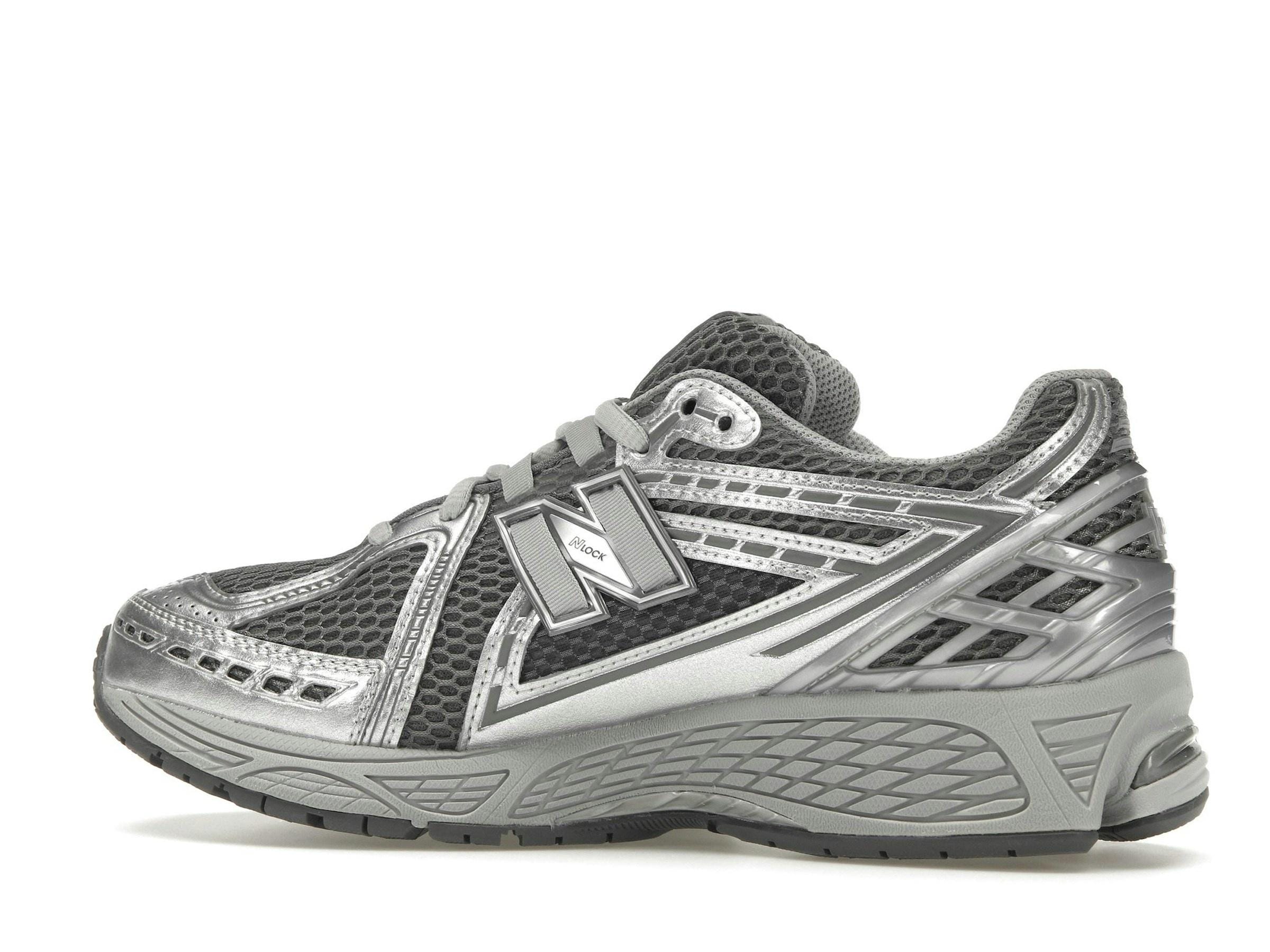 The upper boasts a dark grey mesh construction, enhanced by metallic silver synthetic overlays that wrap around the toe box, midsole, and heel. The signature New Balance “N” logo is prominently featured in a 3D panel design, complemented by N-Lock branding for added support. Further branding details include the “1906R” on the heel overlay and the NB logo on the TPU heel cage. A patterned grey outsole completes the sophisticated look.