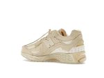 The upper features a breathable mesh textile base reinforced with durable nubuck leather, offering a perfect balance of style and support. The creamy sandstone colorway, extending to the laces, tongue, and sock liner, creates a cohesive and sophisticated look. Subtle New Balance branding on the gray insoles and tongue tag completes the design.