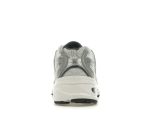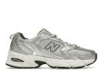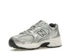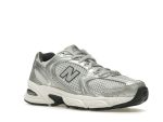 The upper boasts a lightweight and breathable white mesh construction, complemented by sleek silver synthetic overlays for added support and visual interest. A matte grey ‘N’ logo, outlined in black, sits proudly on the side panel, matching the 530 branding on the heel. A convenient pull tab on the heel makes slipping these trainers on and off a breeze, while the New Balance branding on the tongue adds a finishing touch.