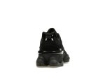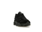 The upper features a black textile base, providing breathability and comfort. Shiny black patent leather overlays add a touch of luxury and visual interest, connecting seamlessly from the toe box, through the lacing system, and wrapping around the midsole for a unique design. Black suede overlays on the toe cap and midsole further enhance the shoe’s texture and depth.