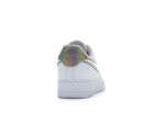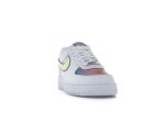 These women’s Air Force 1s feature a clean white leather base, providing a crisp canvas for the eye-catching details. The standout element is the iridescent toe and heel, shimmering with a rainbow effect that beautifully captures the light. Adding a touch of pastel, a pale yellow swoosh accented with purple sits subtly on the side, completing the Easter-inspired aesthetic.