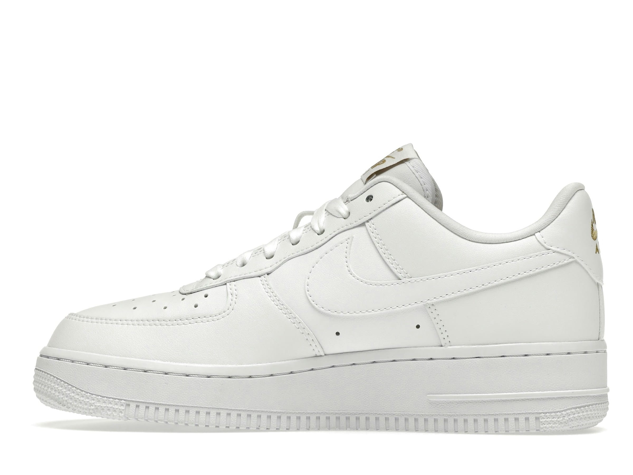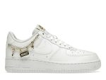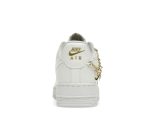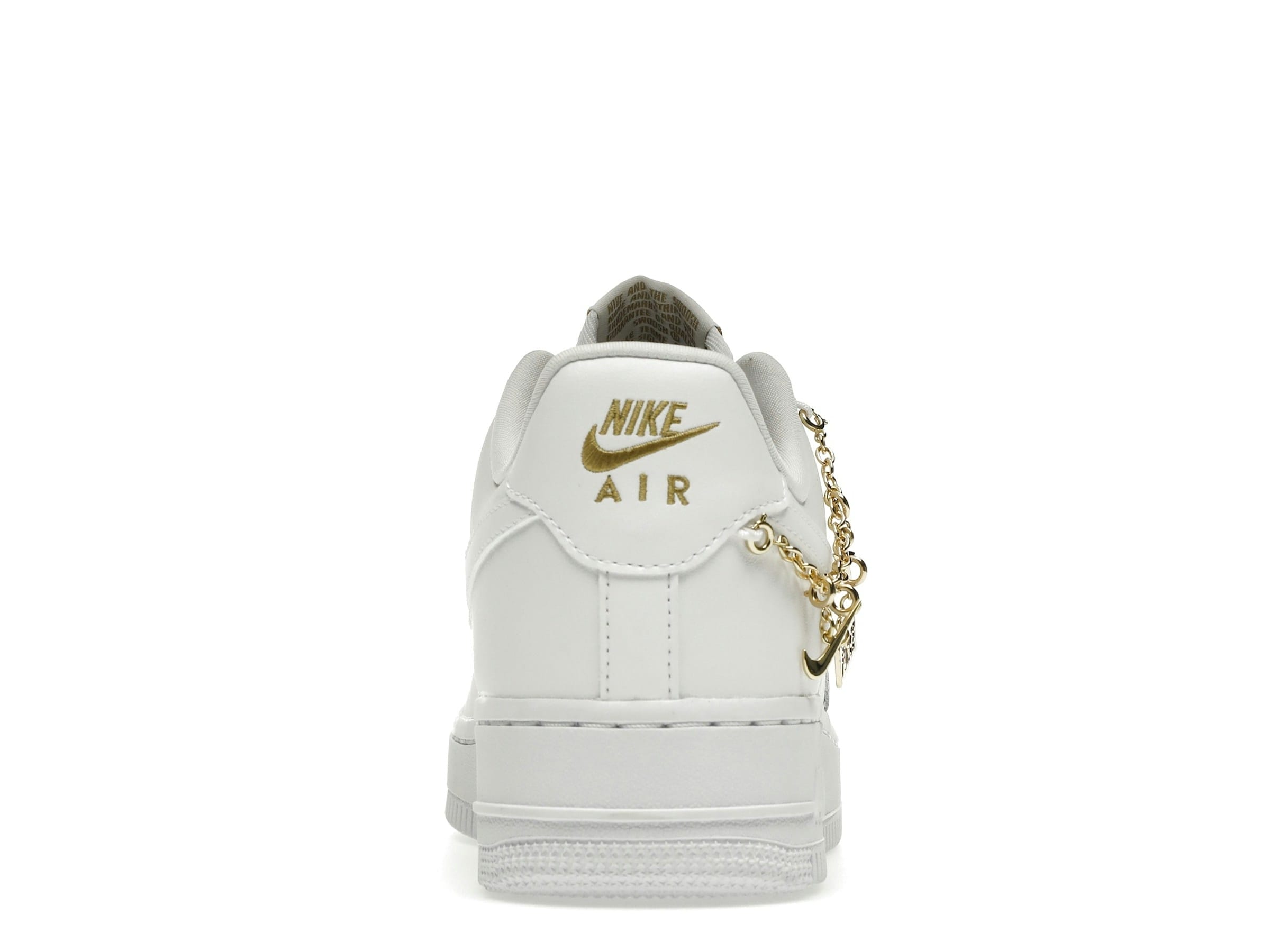 Adding a touch of opulence, a gold metallic chain adorned with Nike charms graces the collar, creating a striking contrast against the white leather. The elegant design is finished with matching gold Nike Air embroidery at the heel, adding a subtle yet impactful signature touch.