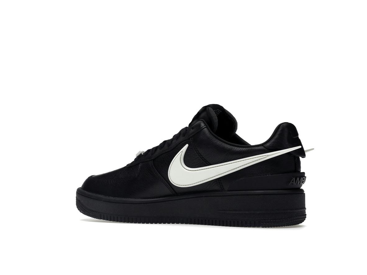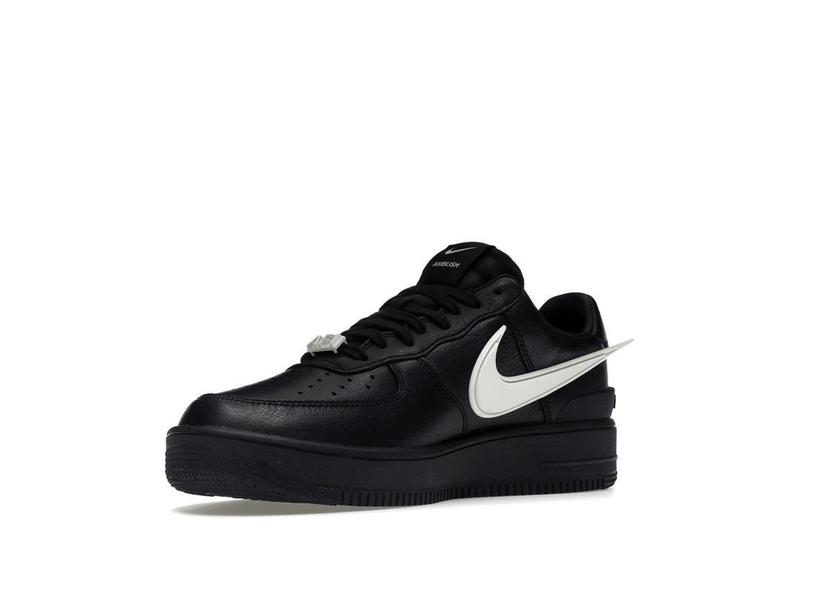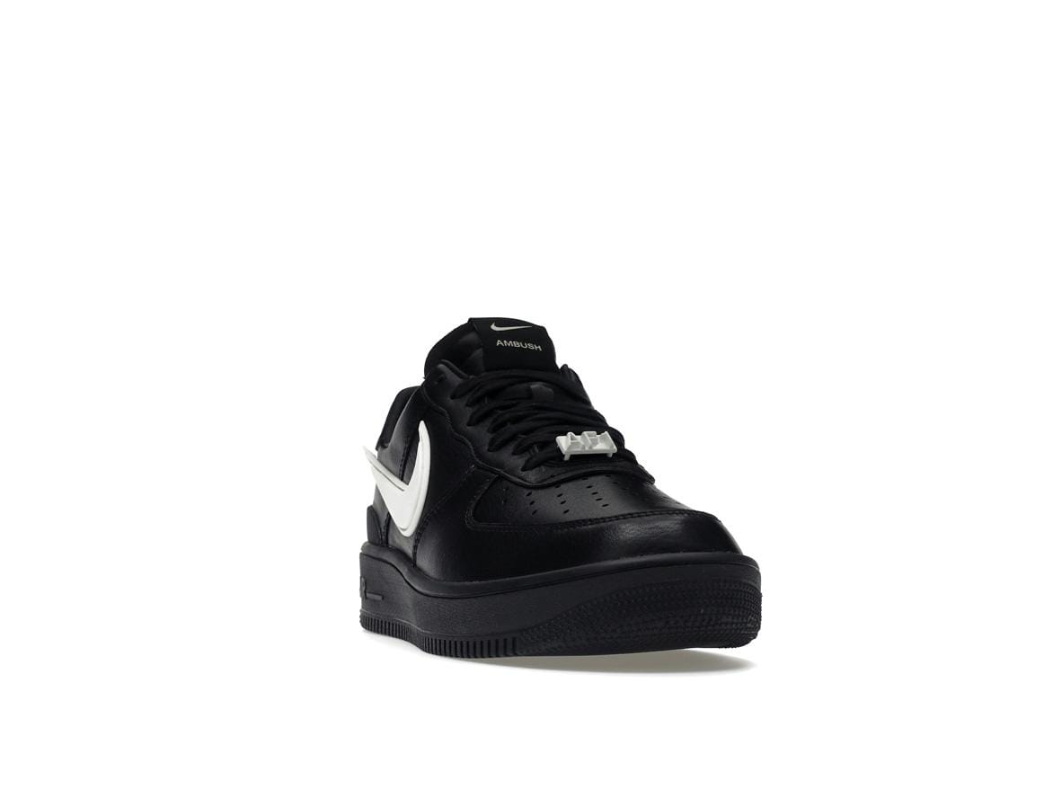 A standout feature is the exaggerated Nike Swoosh on the sides, adding a bold, modern twist to the traditional silhouette. The black tongue features a contrasting white AMBUSH logo and Nike Swoosh, showcasing the collaborative spirit of this exceptional design. Metallic co-branded lace dubraes add a touch of luxury, complementing the premium materials and refined aesthetic.