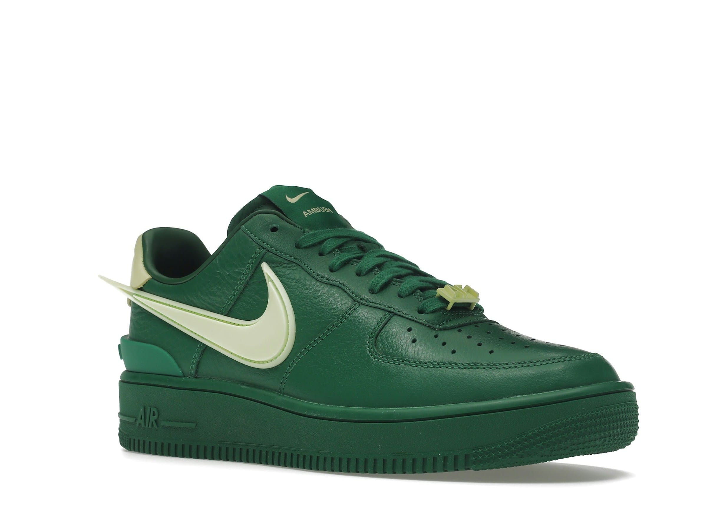 Further enhancing the design is a matching pine green rubber outsole and a noticeable TPU heel clip. These elements work together to create a modern take on a timeless classic, blending high fashion with iconic Air Force 1 design elements. Released on December 16th, 2022, this limited edition sneaker is a must-have for collectors and sneaker enthusiasts alike. The combination of luxurious materials, striking colorway, and unique design details sets the Nike Air Force 1 Low SP AMBUSH Pine Green apart.