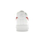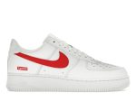 The shoe boasts a crisp white leather upper, showcasing the Air Force 1’s signature perforated detailing and overlaid panels. A bold Speed Red Nike Swoosh provides a striking contrast against the white leather, while the iconic Supreme red box logo is prominently displayed on the rear heel. Traditional Nike Air branding is subtly incorporated on the tongue, heel tab, and the clean white sole.