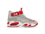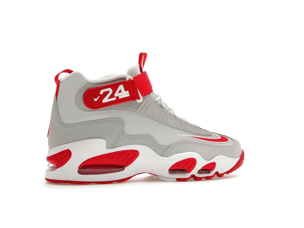 The predominantly gray Nubuck upper pays homage to the Reds’ classic uniform, while vibrant red accents on the pull tabs, cross strap, Nike Swoosh, and outsole add a pop of team spirit. Clean white details on the midsole and laces provide a crisp contrast, complementing the overall aesthetic. The subtle inclusion of Griffey Jr.’s jersey number, “24,” on the cross strap adds a personal touch to this special edition.