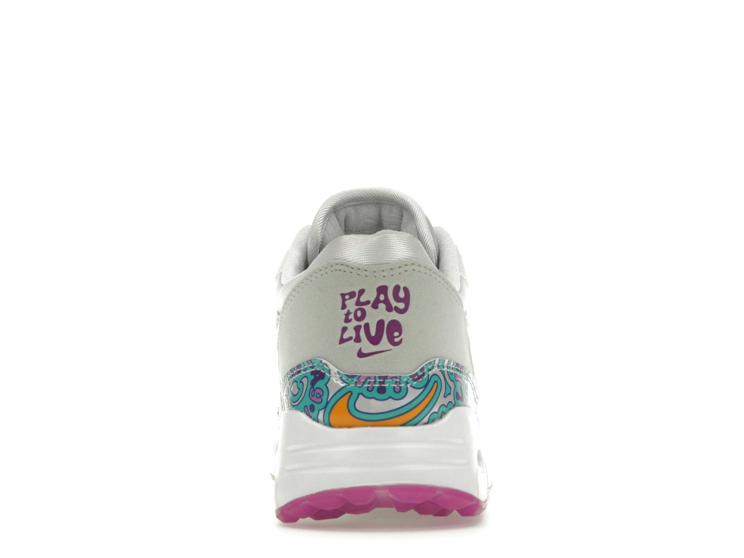 Reimagining the iconic 1985 Air Max 1, this golf-specific design features a waterproof white mesh upper enhanced by Light Silver synthetic suede overlays. A vibrant paisley-inspired pattern in turquoise, violet, and orange accents the mudguard, adding a bold and unique touch. The signature “Live to Play, Play to Live” tagline is subtly incorporated on the lateral Swoosh, rear heel, and translucent outsole, a testament to the shoe’s dedication to both performance and lifestyle.