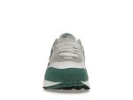 The upper features a premium combination of white leather and mesh, creating a breathable and comfortable feel. Accents of Evergreen Aura green on the mudguards add a vibrant pop of color, complemented by subtle gray overlays for a balanced aesthetic. The iconic Air Max midsole provides superior cushioning and comfort, while the two-toned outsole ensures durable traction.